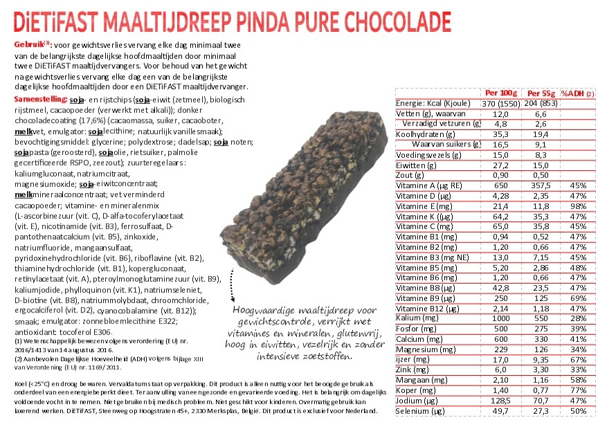 Hoogwaardige maaltijdreep in pinda pure chocolade voor het afslanken en/of gewichtsbehoud, verrijkt met 23 vitamines en mineralen, glutenvrij, hoog in eiwitten, vezelrijk en zonder intensieve zoetstoffen.