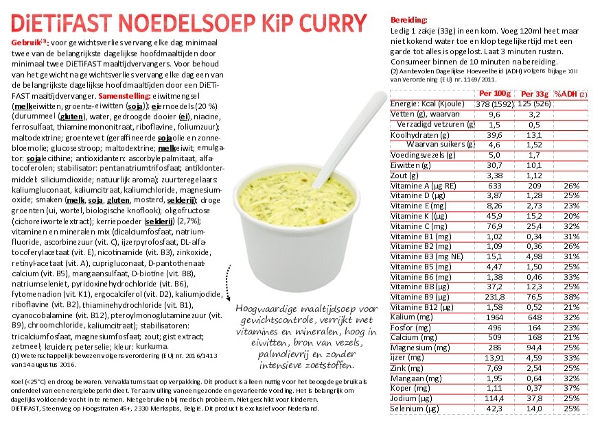 Samenstelling maaltijdvervanger noedels kip currysoep