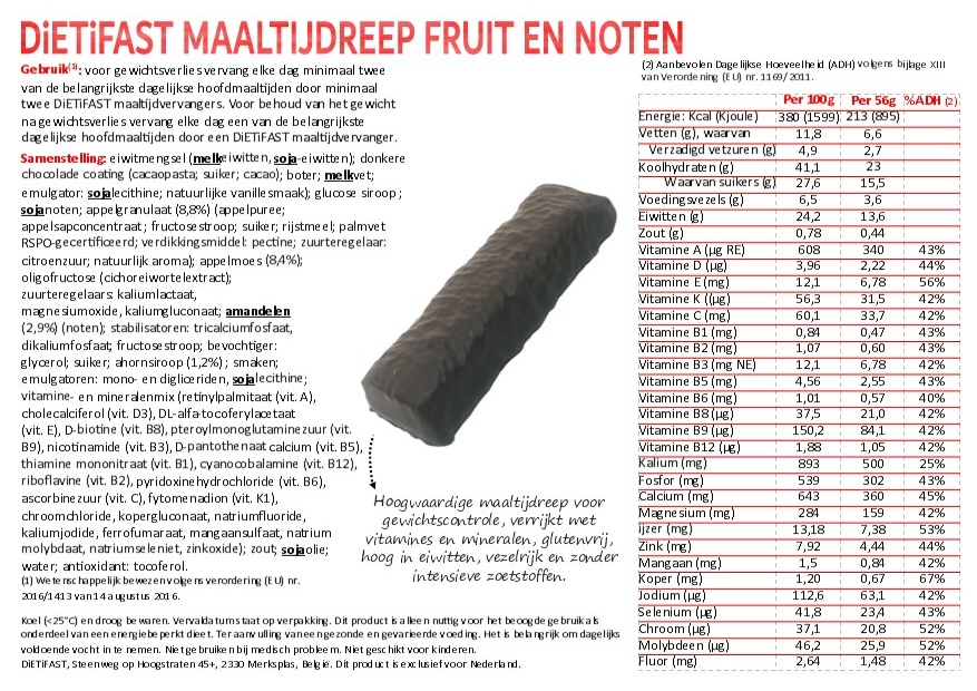 Hoogwaardige maaltijd reep in fruit en noten voor het afvallen en/of gewichtsbehoud, verrijkt met 26 vitamines en mineralen, glutenvrij, hoog in eiwitten, vezelrijk en zonder intensieve zoetstoffen.