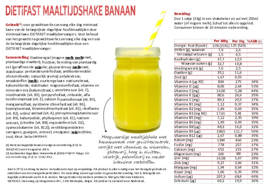 Hoogwaardige maaltijdvervanger shake met banaansmaak voor gewichtscontrole (afvallen en/of gewichtsbehoud), verrijkt met 23 vitamines en mineralen, glutenvrij, hoog in eiwitten, vezelrijk, palmolievrij en zonder intensieve zoetstoffen.