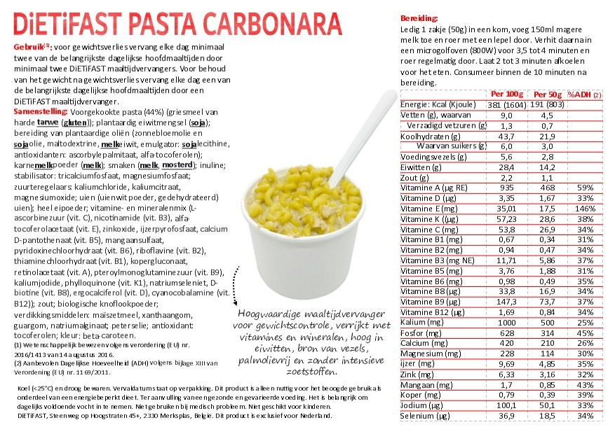 Hoogwaardige maaltijdvervanger pasta carbonara voor het vermageren en/of gewichtsbehoud, verrijkt met 23 vitamines en mineralen, hoog in eiwitten, bron van vezels, palmolievrij en zonder intensieve zoetstoffen.