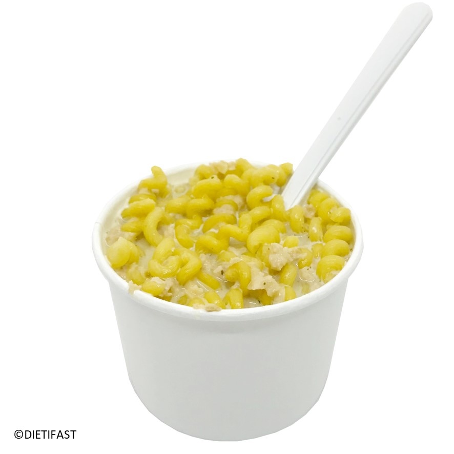 Voorgekookte pasta (44%) (griesmeel van harde tarwe (gluten)); plantaardig eiwitmengsel (soja); bereiding van plantaardige oliën (zonnebloemolie en sojaolie, maltodextrine, melkeiwit, emulgator: sojalecithine, antioxidanten: ascorbylepalmitaat, alfa-tocoferolen); karnemelkpoeder (melk); smaken (melk, mosterd); inuline; stabilisator: tricalciumfosfaat, magnesiumfosfaat; zuurteregelaars: kaliumchloride, kaliumcitraat, magnesiumoxide; uien (uienwit poeder, gedehydrateerd) uien); heel eipoeder; vitamine- en mineralenmix (L-ascorbinezuur (vit. C), nicotinamide (vit. B3), alfa-tocoferolacetaat (vit. E), zinkoxide, ijzerpyrofosfaat, calcium D-pantothenaat (vit. B5), mangaansulfaat, pyridoxinechloorhydraat (vit. B6), riboflavine (vit. B2), thiaminechloorhydraat (vit. B1), kopergluconaat, retinolacetaat (vit. A), pteroylmonoglutaminezuur (vit. B9), kaliumjodide, phylloquinone (vit. K1), natriumseleniet, D-biotine (vit. B8), ergocalciferol (vit. D), cyanocobalamine (vit.B12)); zout; biologische knoflookpoeder; verdikkingsmiddelen: maïszetmeel, xanthaangom, guargom, natriumalginaat; peterselie; antioxidant: tocoferolen; kleur: beta-caroteen.